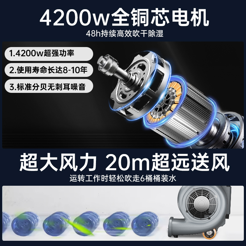 揚子YZ-CGJ001地面吹干機4200W冷熱雙風吹干效果高于自然風機,有限降低使用時間,6擋可調節(jié)橫掃潮濕通風排氣。