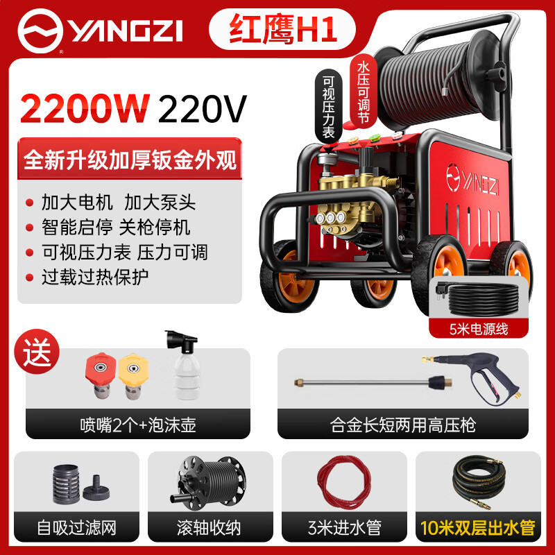 揚子紅鷹洗車機高壓清洗機家用220V大功率洗車高壓水槍刷車泵神器庭院清洗,可視可調(diào)壓力表,高低水壓輕松掌握,針對不同使用場景選擇合適壓力