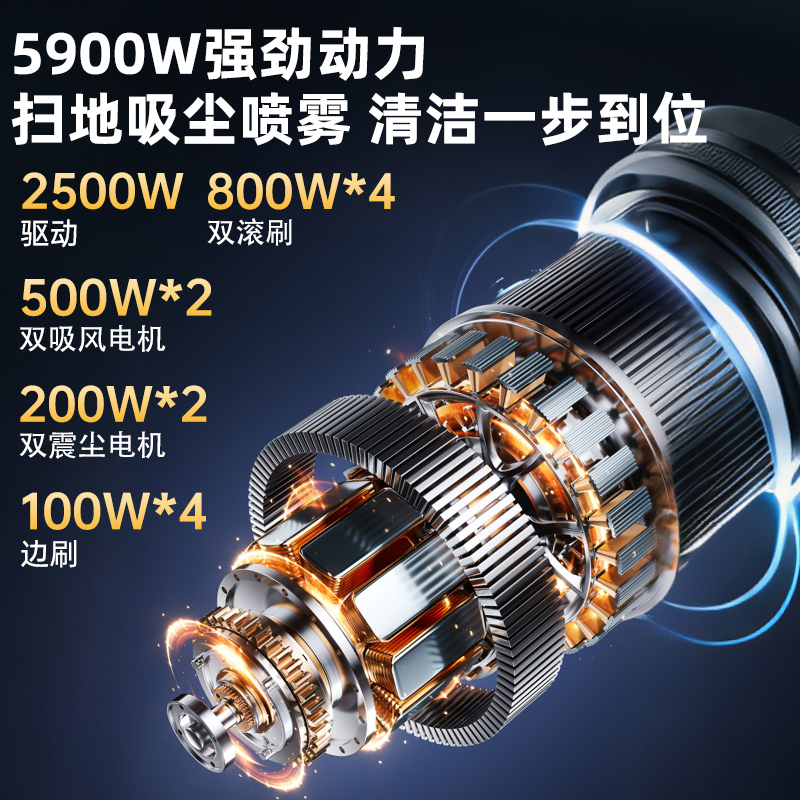 5900W強(qiáng)勁動力,掃地吸塵噴霧清潔一步到位,國內(nèi)知名品牌電池單次滿電可清掃120000㎡