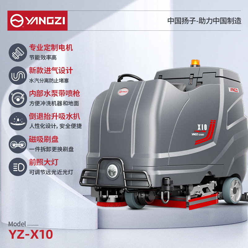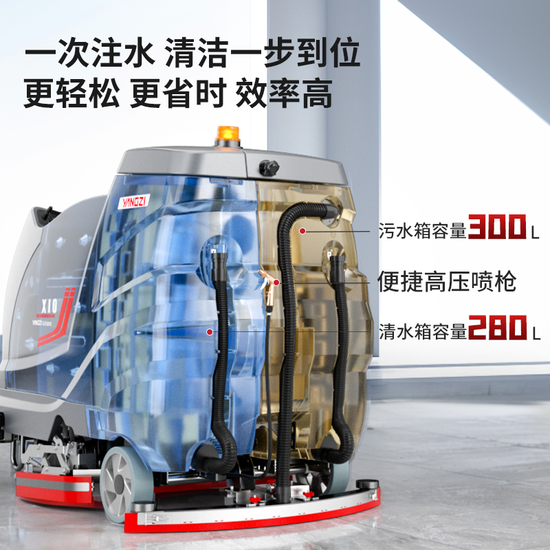揚子YZ-X10大型駕駛式洗地機,1次充電續(xù)航7-8H,配置高壓水槍清潔頑固污漬,智能集成儀表清潔過程得心應手。