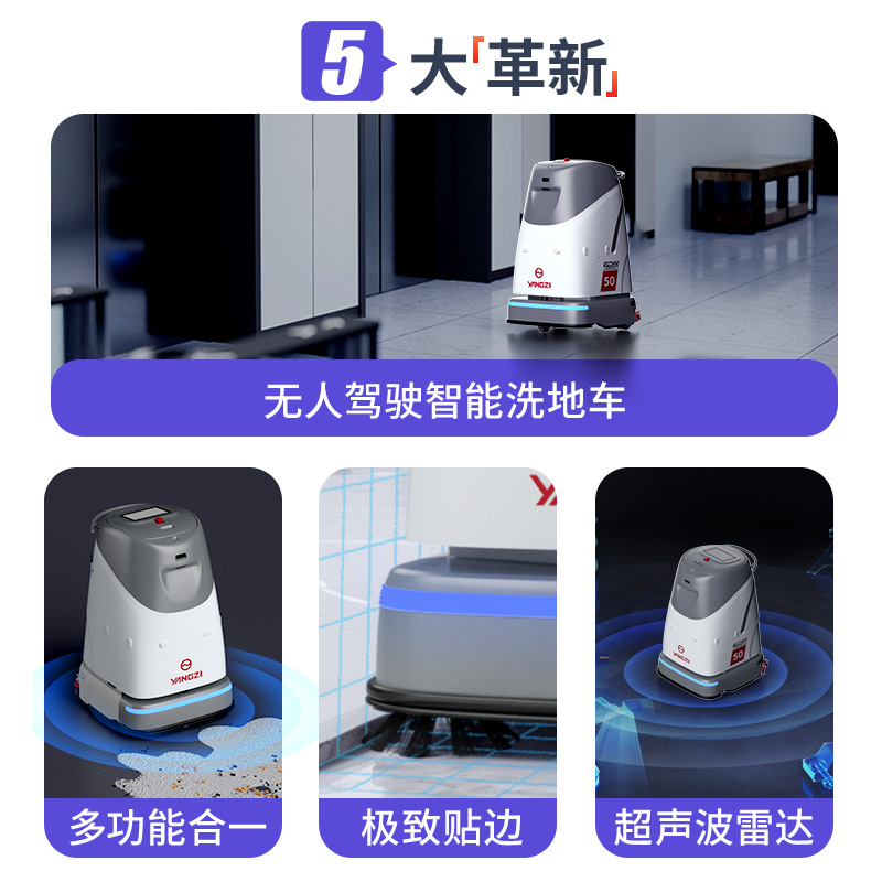 揚(yáng)子YZ-SC50無(wú)人駕駛洗地機(jī)AI智能識(shí)別、全自動(dòng)作業(yè),洗地、塵推、掃地等多種功能可選,智能清潔可自動(dòng)充電、排水、加水、避障等。
